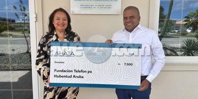 Oranjestad, Aruba – Aruba Hotel & Tourism Association (AHATA) ta haci un donacion na Fundacion Telefon Pa Hubentud Aruba, reafirmando asina su compromiso pa sostene e bienestar di nos muchanan y hobennan. E cheque di AFL 7.500 a wordo entrega pa Vanessa Rasmussen di AHATA na James Sneek di Fundacion Telefon pa Hubentud. Cu e contribucion aki, e asociacion di e industria di turismo ta reconoce e rol vital cu Telefon Pa Hubentud ta hunga den solucionnan pa Aruba su retonan social.