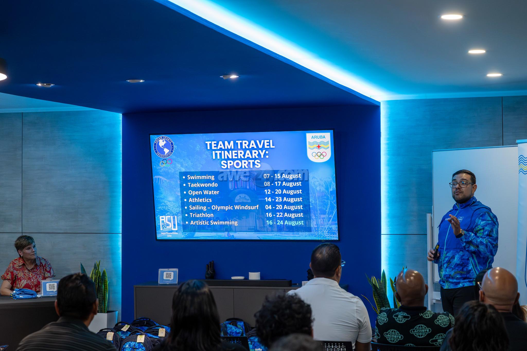 Despues a sigi un presentacion tecnico y logistico, unda Directora Tecnico Monica Fajardo y Director di Operacion Jonathan Wever a presenta tur e informacion relevante pa cu e weganan ASU2025 pa asina tur miembro di delegacion ta actualisa y tin tur informacion. Aki a presenta tambe e delegacion oficial, cu ta conta cu 12 atleta total den 7 diferente deporte. Ta mira un grupo hoben y cu hopi entusiasmo cu gran parti lo participa na un wega di e tamaño aki.