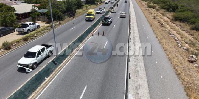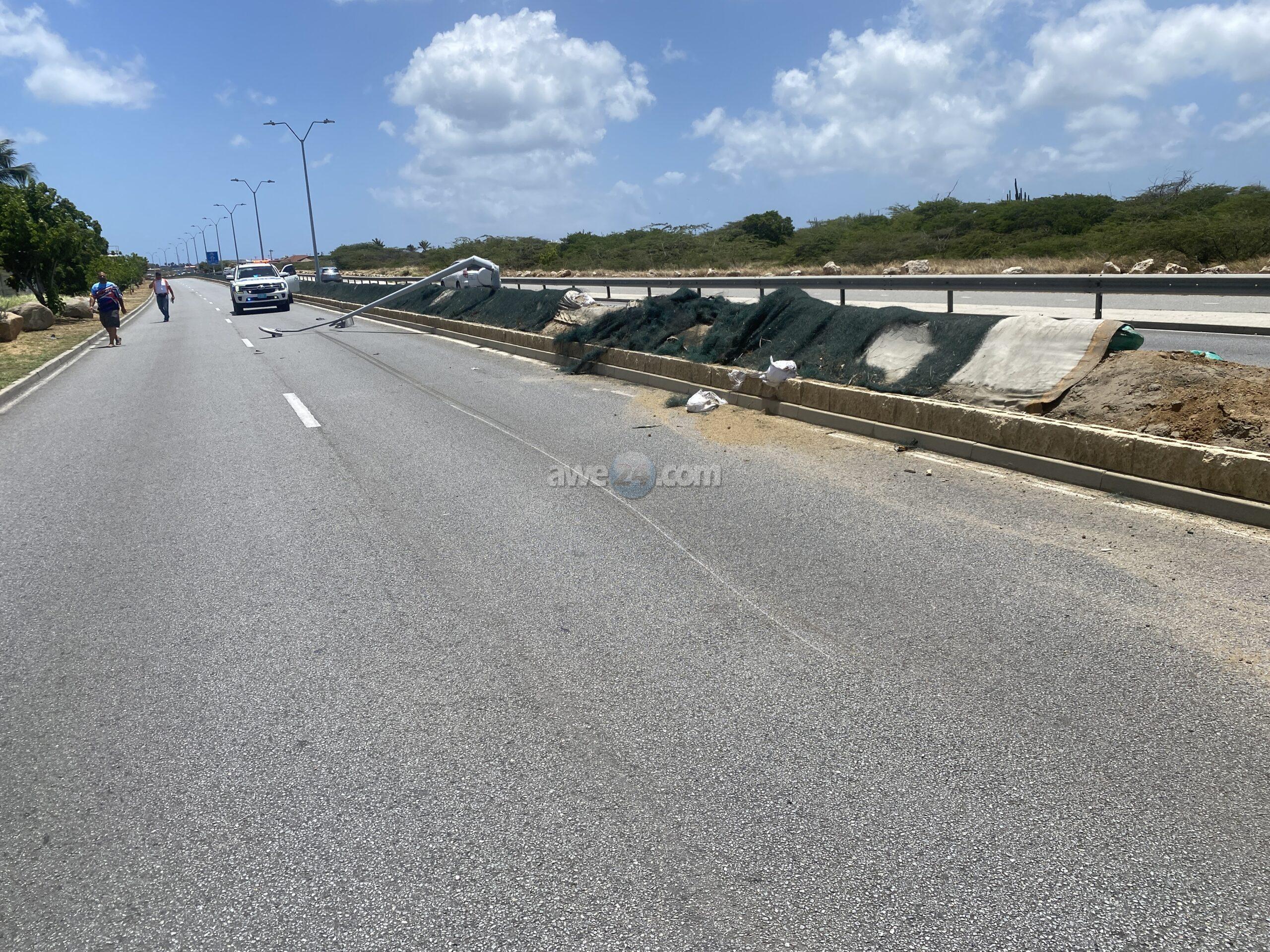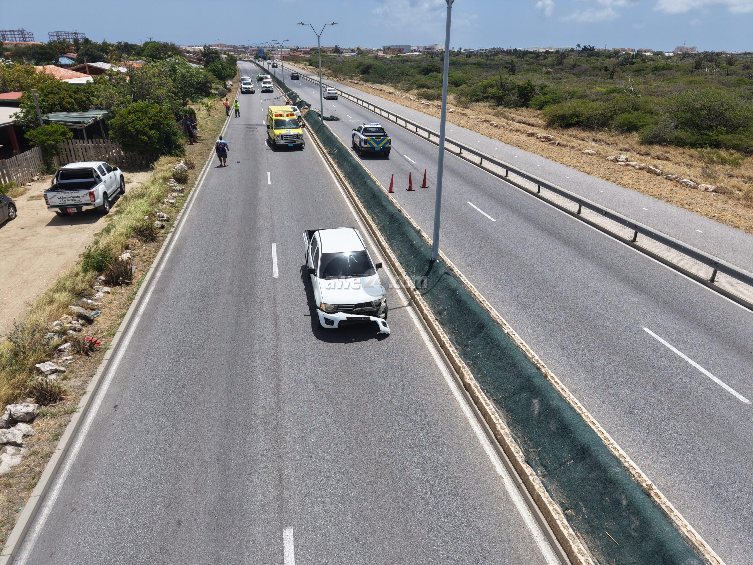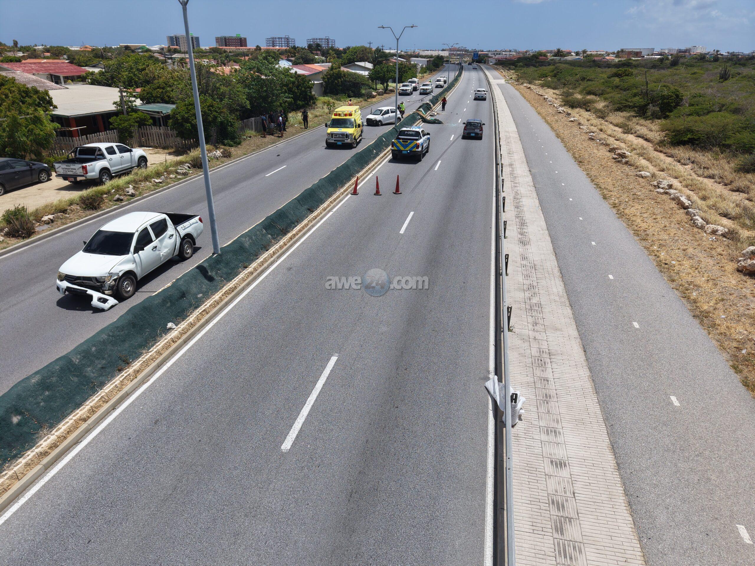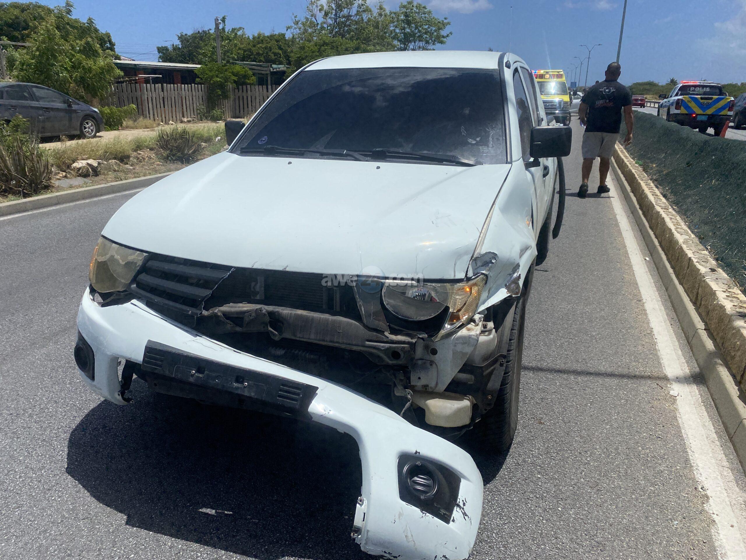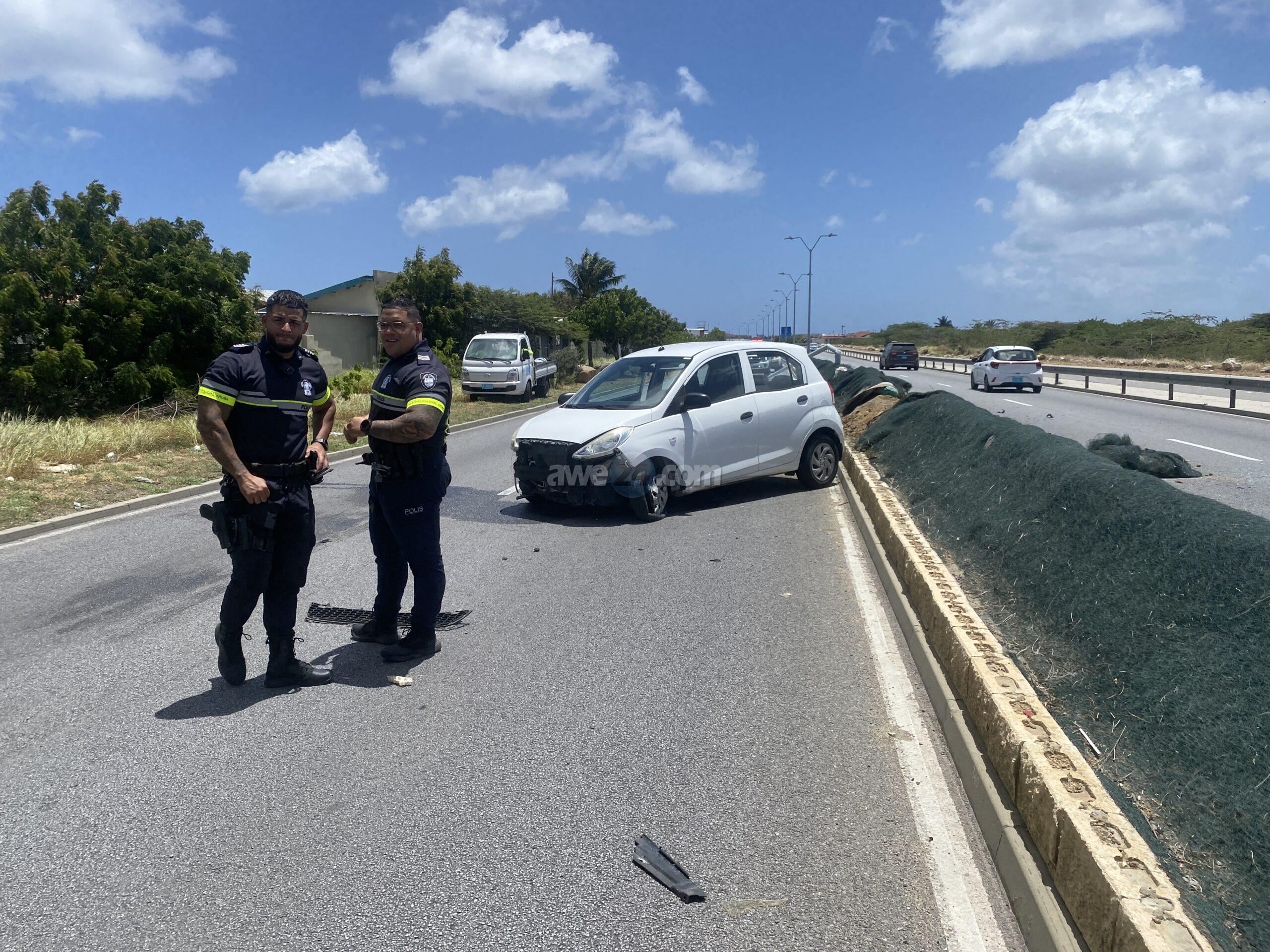 Dialuna merdia a drenta informe di un accidente cu hende herida y pega den auto riba E.J. “Watty” Vos Blvd. panort di Madiki, mesora a dirigi tanto polis como ambulans na e sitio. Na yegada di e patruya a bin compronde cu aki ta trata di un accidente unda e chauffeur di un Hyundai Atos coriendo cu velocidad halto pa no a dal tras di e auto banda drechi a bay pasa un pick-up banda drechi y drenta paden e banda robes ye pickup a dal e bir’e y mande riba e “median” dal palo di lus y bolbe dal e pickup den banda robes y bay cay riba caminda. Debi na e multiple impacto e chauffeur a resulta herida. Na yegada di e ambulans a bin compronde cu e porta di auto no por a habri y a pidi “materiale wagen” pa bini. Pero asina mes a logra habri e porta y a cancele. E personal di ambulans a atende e victima y a transporte pa hospital.