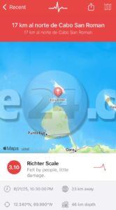 Diahuebs anochi a drenta informe di un sismo sinti pazuid di Aruba pa exactamente 10:30pm. E epicentro tabata na 17 KM panort di Cabo San Roman y tabata tin un magnitud di 3.10 na e scala di Richter. Door cu tabata den anochi no por a logra raporta ningun daño visibel na e momentonan ey pero si por a sinti e efectonan di e sismo.
