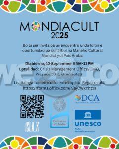 Departamento di Cultura Aruba (DCA), hunto cu Gobierno di Aruba, ISLA.X y UNESCO Aruba National Commission, ta invita tur interesadonan pa participa den Encuentro Mondiacult 2025, cu lo tuma lugar: