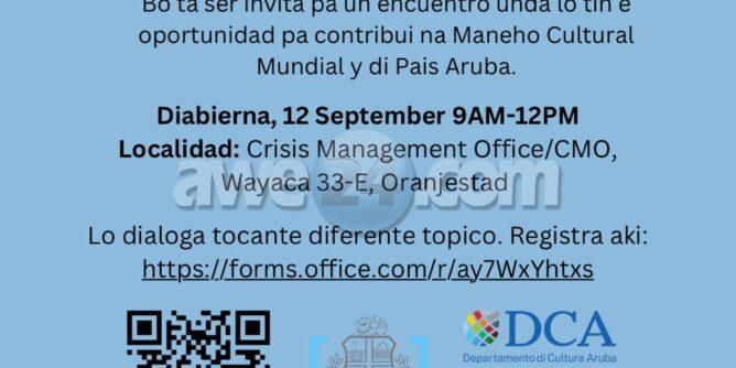 Departamento di Cultura Aruba ta invita tur actornan cultural, institucionnan, artistanan, y comunidad en general pa forma parti di e dialogo aki y contribui na un futuro cultural sostenibel pa Aruba.