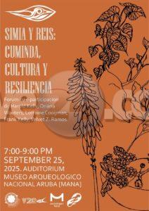 Artista Velvet Zoé Ramos y Museo Arqueologico Nacional Aruba – MANA, ta invita comunidad pa e foro “Simia y Reis: Cuminda, Cultura y Resiliencia”, cu lo tuma luga den auditorio di MANA diahuebs 25 di september 2025 di 7’or pa 9’or di anochi. E foro menciona ta parti di Velvet su exposicion “Interlasado: Pasado Presente” te december awor na MANA.