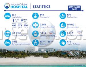 Na luna di september a hospitalisa 851 pashent di cual 54.4% tabata admision di emergencia. E promedio di duracion admiti na HOH na luna di september tabata 3.6 dia. Ocupacion di cama na luna di september tabata 74% cu ta mas abou cu luna di september 2024 (87.8%). Un total di 643 cirugia a tuma luga den nos salanan di operacion cu ta mas halto cu september 2024 (579 operacion).