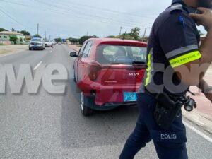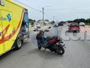 Diabierna merdia a drenta informe di un accidente cu hende herida na Boegoeroei, mesora a dirigi tanto polis como ambulans na e sitio. Na yegada di e patruya a bin compronde cu aki ta trata di un accidente unda e dama chauffeur bayendo zuid den un Kia Picanto di huur a para pa duna chens na un otro auto pero su tras tabata bini un scooter pasando autonan y aunke ela purba desvia toch ela dal na e skina patras di e Kia y a cay keda herida benta na e suela. Na yegada di e ambulans nan a atende e motociclista y a transporte pa hospital.