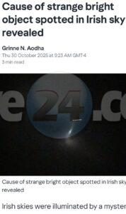 Diahuebs anochi varios hende a mira lusnan straño ta traspasa den nos atmosfera y tabata tin duda di kiko esaki por tabata. A bin resulta cu esakinan ta restonan di un raket cu a ser lansa diaranson y dependiendo unda ela sali e ta manda tanto fuel como material den nos atmosfera. Na Irlanda esaki a ser mira diaranson anochi y ayera den nos area.