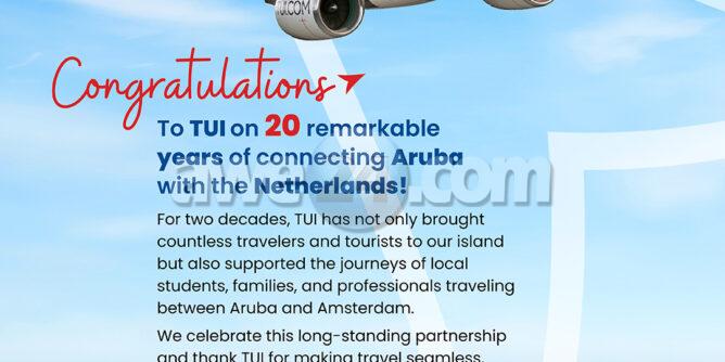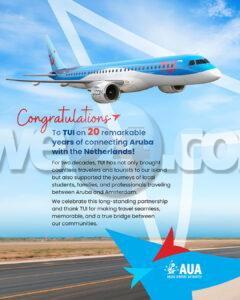 Jo-Anne Arends, Aviation Business Development Executive na AAA, a comenta cu: “TUI a resulta di ta un partner confiabel y consistente den conecta Aruba cu Hulanda. E logro di 20 aña aki t’un prueba di e forsa di nos aliansa y e compromiso comparti cu excelencia cu ambos organisacion ta sostene. Den transcurso di e añanan, TUI Fly no solamente a trece un sin fin di biahero y turista pa nos isla pero tambe a sostene e biahenan di studiantenan local, famianan y profesionalnan cu ta biaha entre Aruba y Amsterdam. E conexionnan aki a fortalece nos comunidad y a profundisa e relacion entre nos isla y Hulanda. Door di celebra e logro remarcabel aki, nos ta anticipa tambe pa crecemento continuo, innovacion y sostenibilidad den e decadanan venidero.”