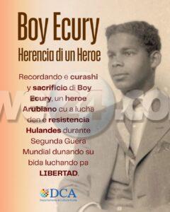 Boy Ecury ta un testimonio di orguyo Arubiano y un ehempeluniversal di amor pa libertad y humanidad. Departamento di Cultura Aruba ta invita comunidad Arubiano pa keda honra y recorda e legado di Boy Ecury — un heroe cu a duna su bida palibertad y humanidad.