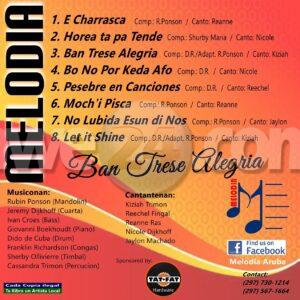 Pa grupo Melodia tin como cantante Kiziah Trimon, Nicole Dijkhoff, Reechel Fingal, Reanne Ras y Jaylon Machado. E musiconan ta Dido de Cuba (drum), Cassandra Trimon (precuccion), Franklin Richardson (congas), Sherby Olliverre (Timbal), Giovanni Boekhoudt (piano), Jeremy Dijkhoff (Cuarta), Ivan Croes (Baho) y Rubin Ponson (mandolin).