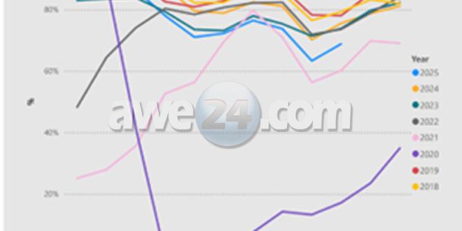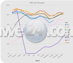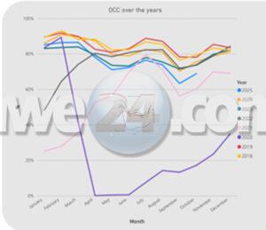 E proyeccion actual pa ocupacion averahe di hotel na 2025 ta 77%, cual ta 5% menos cu grado di ocupacion na 2024.