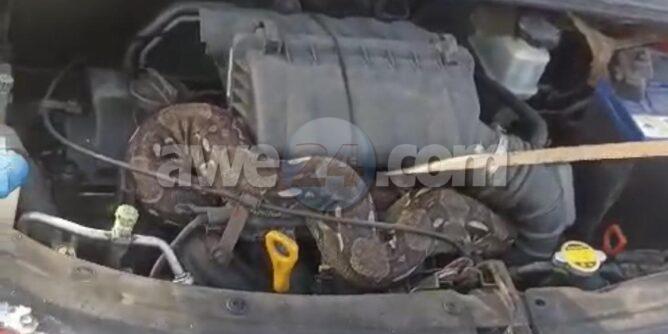 Diaranson merdia un Boa grandi y gordo a lora den un motor di un auto y e hendenan tabata busca manera pa sake pero e tabata hopi dificil pa logra sake ya cu mester a pone hopi forsa y no tabata facil.