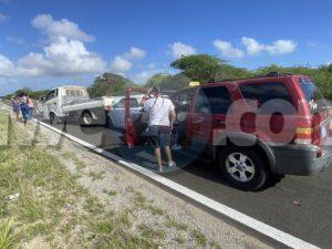Diahuebs mainta a drenta informe di un accidente cu hende herida riba Ser’i Teishi, mesora a dirigi tanto polis como ambulans na e sitio. Na yegada di e patruya a bin compronde cu aki ta trata di un accidente di cadena cu 4 auto envolvi. E chauffeur di un taxi no a regula su velocidad ni mantene distancia ya cu e brake di e auto lo a faya y a bay dal tras di un MG3 cual consecutivamente a bay dal tras y a bay parcialmente bao di un Hyundai truck y esaki finalmente a bay dal tras di un Nissan. Den e impacto aki 2 hende a resulta herida. Na yegada di e 2 ambulansnan nan a atende e victimanan y a transporta nan pa hospital.