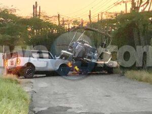 Diaranzon atardi a drenta informe di un accidente un auto lastrando un boto y un Jeep na Sero Janchi, mesora a dirigi un patruya na e sitio. Na yegada di e patruya a bin compronde cu aki ta trata di un accidente riba un caminda smal unda un tin cu cede preferencia na e otro contrario ya cu tin un baranca pega riba e caminda y como cu e ta smal mester practica cortesia pero no a haci esey y a start un discucion cu a escala te na maltrato. Polis a pidi pa ambulans pa e chauffeur cu a ser agredi pa e otro hobennan di e otro vehiculo pero como a duna adres robes pa ora cu ambulans yega ya caba ela bay hospital cu auto particular. Un rato despues e chauffeur di e pick-up a regresa y polis a detene.