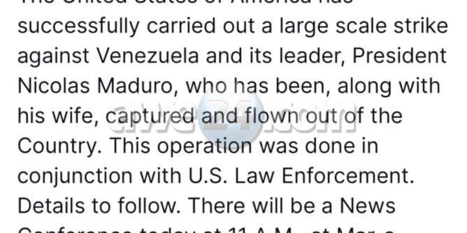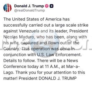 Den oranan di awemadruga avionnan militar americano a bula riba Caracas lansando bomnan strategico mientras riba tera a logra captura Nicolas Maduro y su casa y a sacanan cu avion for di Venezuela. Tur esaki a sosode bao di un plan strategico di inteligencia y forsa militar americano. Awemainta pa 11’or Presidente Trump lo tene un conferencia di prensa cu tur luho di detayes y e pasonan cu lo sigui. Te ainda no a haya ningun contra atake di Venezuela.