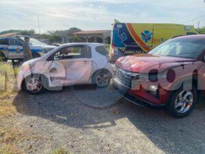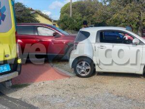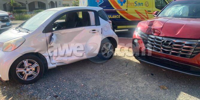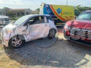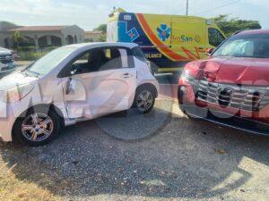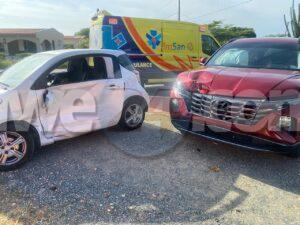 Dialuna mainta a drenta informe di un accidente banda di e Veld di San Luis na Savaneta, mesora a dirigi tanto polis como ambulans na e sitio. Na yegada di e patruya a abin cincompronde cu e Toyota IQ a subi e crusada sin a duna e Hyunday preferencia y nan a dal den otro. Debi na e impacto e pasahero sinta den banda den e Toyota IQ a resulta herida. Na yegada di e ambulans nan a atende e victima y a transporte pa hospital.