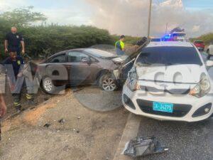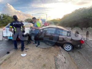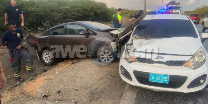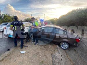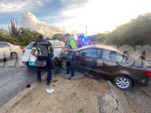 Dialuna mainta tempran a drenta informe di un accidente pabao di rotonde Tanki Flip, mesora a dirigi tanto polis bombero y ambulans na e sitio. Na yegada di e patruya a bin compronde cu e chauffeur di un Kia Rio bayendo pabao a perde control bay otro banda di caminda bay cay den e greppel, ora ela cay den e greppel e parti na halto a baha riba e hood di e trafico contrario cu tambe ta un Kia Rio pero hatchback. Bomberonan a bay na e sitio pasobra lo a kere cu tabata tin hende pega den e auto pero esey no tabata e caso y ambulans a presenta unicamente pa revisa e chauffeurnan cu tabata envolvi.
