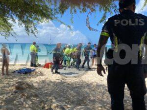 Diamars mainta a drenta informe di cu un dama turista crucero cu tabata cu su famia disfrutando di nos “beachnan” a hay’e den problema ora un ataque di curason a dal e diripiente y a haya problema guliendo awa di lama, nan a trece tera ainda tabata tin pulso y mesora a cuminsa cu CPR mientras a avisa tanto polis como ambulans, na yegada di e patruya di strandpolitie e agentenan riba turno tabata suministra CPR. Na yegada di e ambulans solamente un di e personal a suministra CPR pero tur e esfuersonan ey tabata envano. Despues di varios intento a determina cu e dama di 58 aña a fayece y a stop cu e re-animacion y a declar’e morto. Na yegada di e dokter forensyco a constata cu e dama turista crucero a fayece! E dama tabata hunto cu su casa y yiunan pasando nan vacacion y a bin fayece. Na famia di e fayecida nos ta extende nos mas sincero palabranan di condolencia.