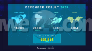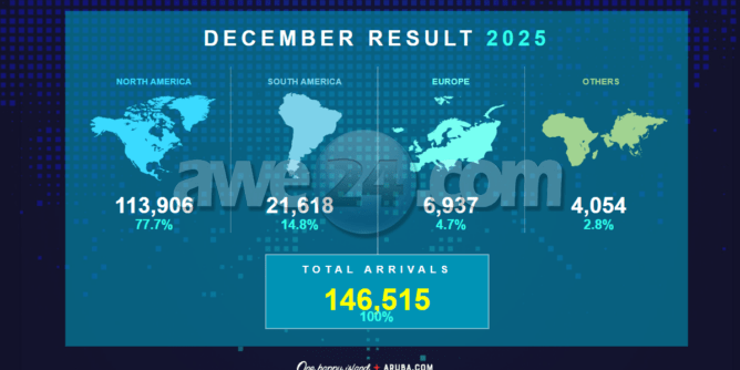 Durante december 2025, Aruba a ricibi un total di 146,515 turista stay-over, representando un crecemento di 14.3% compara cu december 2024. Esaki ta un aumento significativo den yegadanan, destacando e posicion fuerte di Aruba como destino preferi. E incremento mas notabel a bini for di mercado Norte Americano, cu a contribui 77.7% di total bishitante. Latino America a ocupa 14.8%, Europa 4.7%, y otro region 2.8%.