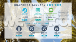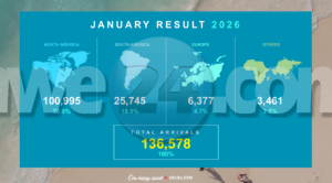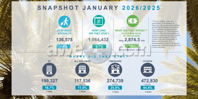 E panorama di turismo pa januari 2026 ta mustra un combinacionsolido di yegadanan, estadia prolonga y un mescla amplio di mercado. Aruba a ricibi un total di 136.578 bishitante stayover, mientras cu e cantidad total di nochinan di estadia a yega 1.064.432, resultando den un promedio di estadia, esta Average Length of Stay (ALOS) di 7.8 anochi, un cifra cu ta refleha un nivel mas halto di compromiso y interaccion cu Aruba como destinacion.