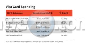 Durante 2025, Aruba a registra 1,028,071 Visa cardholders di 152 pais, cu a genera un total di USD 696 miyon den gasto. Esaki tamustra un patronchi di gasto amplio, unda tanto cardholders como transaccionnan a sigui subi na ritmo saludabel.
