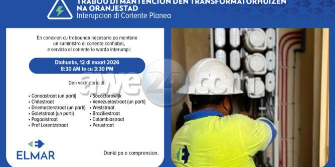 Pa sigui garantisa suministro di electricidad; ELMAR lo ehecuta trabou di mantencion den e area di Oranjestad.
