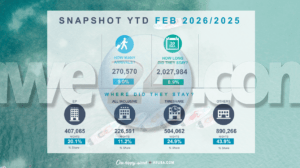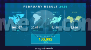 Den luna di februari 2026, Aruba a ricibi un total di 133.992 bishitante stayover, mientras cu e cantidad total di nochinan di estadia a yega 963.552. Esaki a resulta den un promedio di estadia (Average Length of Stay – ALOS) di 7,2 anochi, cu ta refleha un mescla consistente di duracion di estadia y tipo di biahe durante e luna.