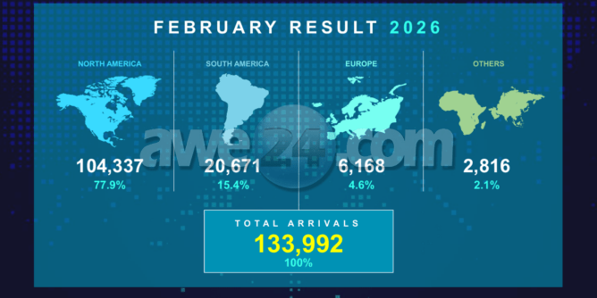 E distribucion di mercado durante februari a mustra cu Norte America a sigui ta e region cu e mayor aporte, representando 77,9% di tur bishitante. Latino America a contribui cu 15,4%, Europa cu 4,6%, mientras cu otro regionnan a representa 2,1% di total di yegadanan.