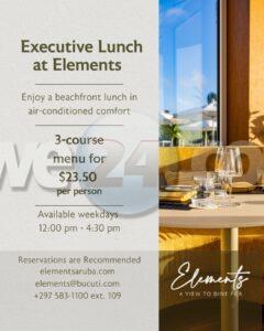 E menu di Executive Lunch ta refleha e filosofia distintivo di Elements di farm-to-future, combinando inspiracion Mediterraneo cu influencia Caribense y un enfoke fuerte riba ingredientenan fresco y localmente abasteci. E menu ta cambia regularmente pa mantene interesante. Huespednan cu ta desea di ordena fuera di e menu fiho, tambe ta bonbini pa asina explora e menu completo di almuerzo à la carte.