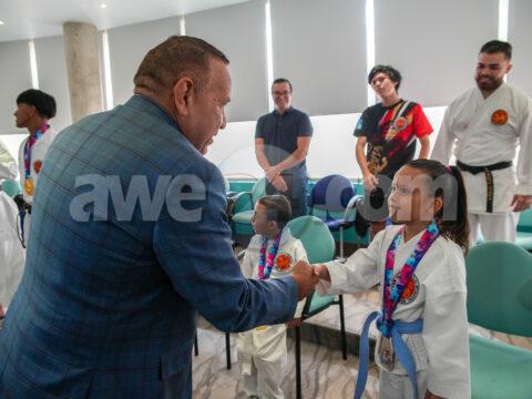 ORANJESTAD: Recientemente, Minister di Enseñansa y Deporte Endy Croes a ricibi bishita di team Shotokan Karate Do International Aruba na Bestuurskantoor. Sensei Gustavo Velasquez, Sensei…