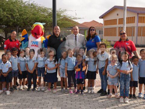 ORANJESTAD: En conexion cu Weganan Escolar 2024, Minister Endy Croes hunto cu mascota Wiwi a bishita dialuna mainta scol basico y preparatorio Colegio Conrado Coronel….