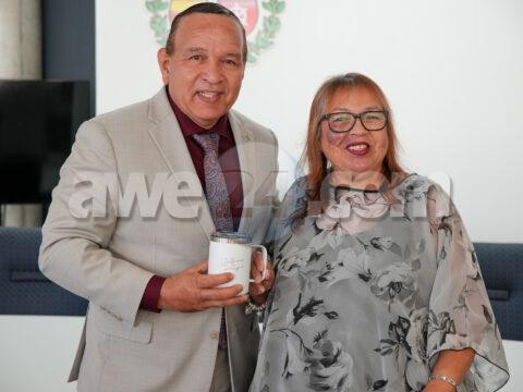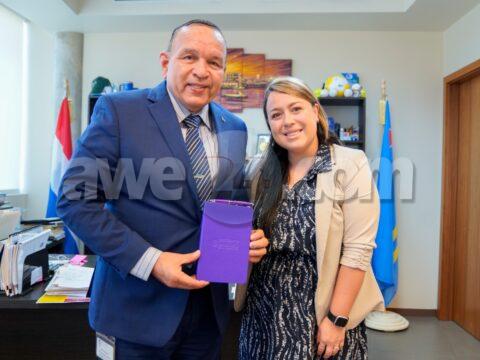 ORANJESTAD: Diaranson mainta, Minister di Enseñansa y Deporte Endy Croes hunto cu Prome Minister Evelyn Wever-Croes a ricibi bishita di Sra. Joselyne Oduber-Jacobs cu a…