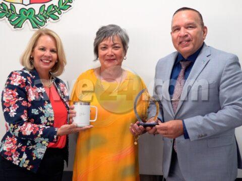 ORANJESTAD: Recientemente, Minister di Enseñansa y Deporte Endy Croes y Prome Minister Evelyn Wever- Croes a ricibi bishita di tres (3) maestra cu ta celebrando…
