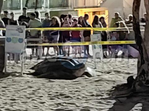 Tortuga a subi strand pa pone webo banda di Moomba Beach, espectaculo completo pa e bishitantenan