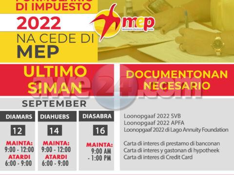 Nos a drenta den e ultimo siman di e campaña pa yenaformulario di Impuesto 2022. Lider di MEP Evelyn Wever-Croes, den nomber di Partido MEP…