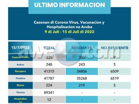 ORANJESTAD- 15 di juli 2022: Segun resumen semanal di awe diabierna, 433 persona a recupera den e siman aki y un total di 339 caso…
