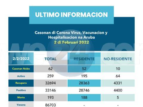 ORANJESTAD- 2 februari 2022. Segun resumen di awe 91 persona a recupera y un total di 62 caso nobo di COVID-19 a keda registra di…