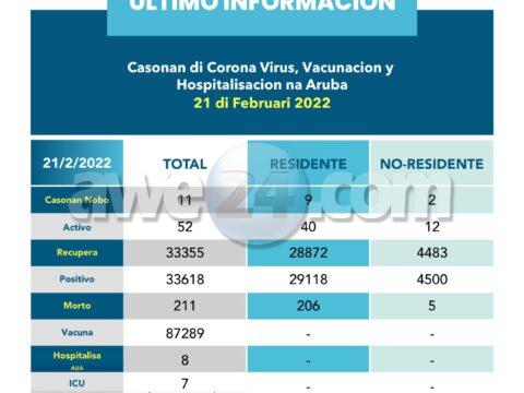 ORANJESTAD- 21 februari 2022. Segun resumen di awe 7 persona a recupera y un total di 11 caso nobo di COVID-19 a keda registra di…