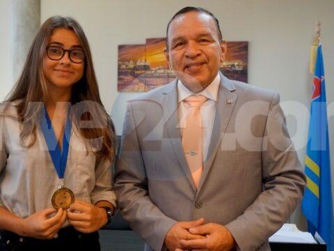 ORANJESTAD: Recientemente Minister di Deporte, Endy Croes a tuma un momento pa felicita y reconoce ciclista Rebecca Jansen cu a conkista varios medaya tanto local…