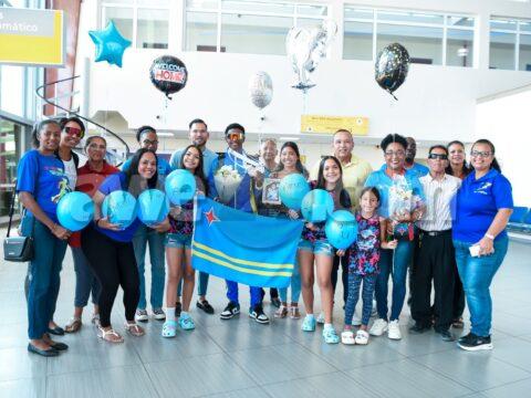 ORANJESTAD: Diasabra den ora tempran di mainta, Minister Endy Croes, famia y amigo a ricibi nos atleta Wyndel Beyde na su yegada na Aeropuerto…
