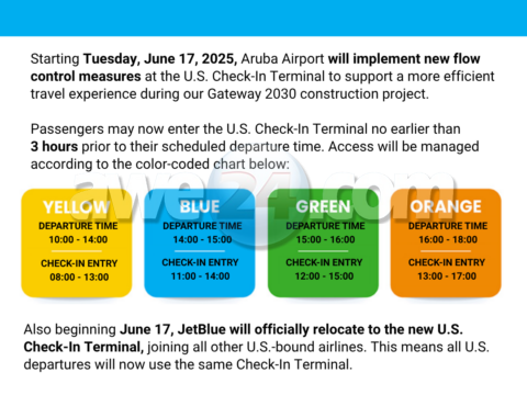 Aeropuerto di Aruba ta introduci ‘Control di fluho di pasahero’ pa biahenan pa Merca Orario nobo di check-in cu codigo di color ta inicia diamars 17 di juni [🇦🇼🇺🇸🇪🇸]