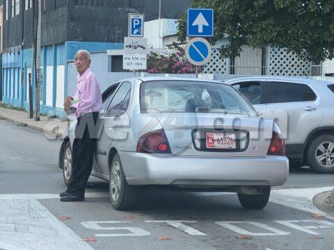 Chauffeur a bay tuma un birada grandi pa drenta e ATM y e auto su tras a bay dal su tras