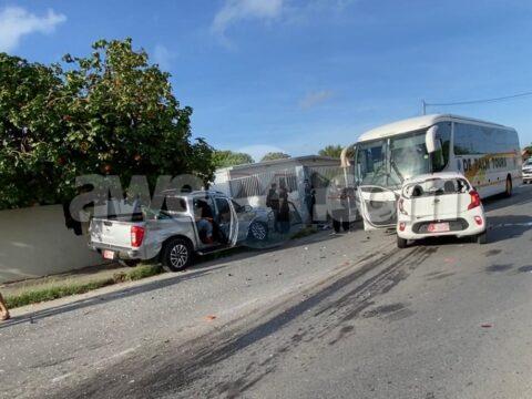 [VIDEO] Auto a bini for di direccion prohibi dal un pick-up den banda mand’e dal cura y e auto mes a bay dal riba un bus