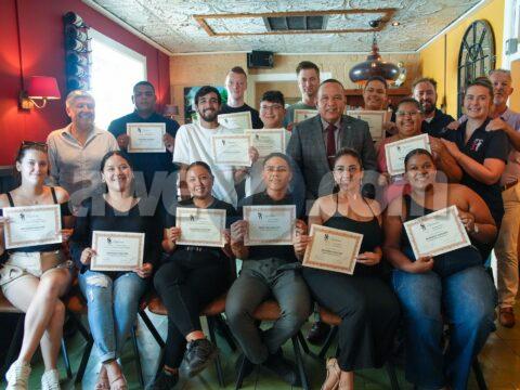 ORANJESTAD: Diamars merdia, Minister Endy Croes a atende e ceremonia di graduacion di 17 empleado di Aruba Wine and Dine cu a termina nan curso…