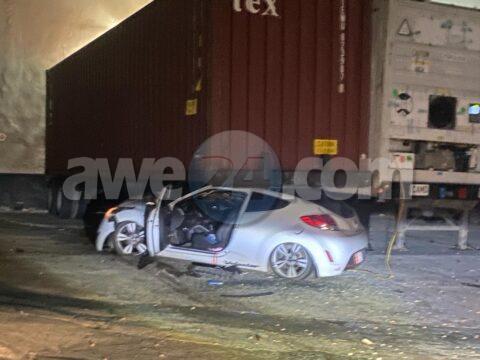 Chauffeur coriendo auto cu velocidad halto a perde control bay pega bao di un container riba un trailer
