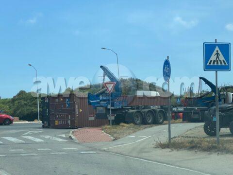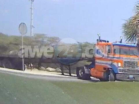 Diahuebs mainta ora cu trafico a ser tarda pa un trekker cu tabata lastrando un container a kentel na e rotonde Mahuma un otro trekker…